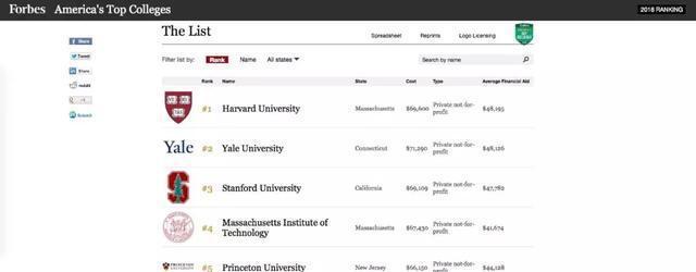 这里需要注意的是,福布斯的排名范围只针对美国的大学,而US News的排名是全球范围内的排名。所以通常榜单中位列前十名的英国牛津和剑桥并未出现在福布斯的榜单中。
