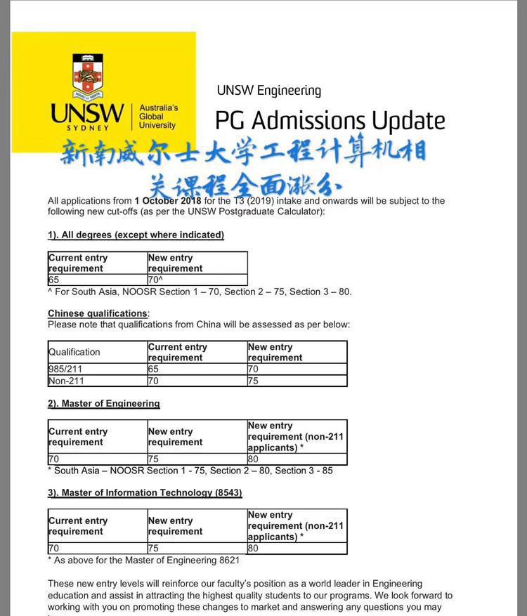 除了澳国立的满位通知外,还有两所学校也给了我们大大的刺激,首先就是新南威尔士大学的涨分,IT专业以及工程专业在2018年10月1日之后就都要全面涨分了,比之前的要求足足涨了8分之多。