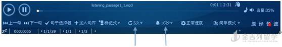 接下来,进入分句精听,也就是听写的主要过程。我们需要对主界面进行一些按钮的调整。句子重复调整到5遍,句子间隔调整到10—15秒(主要看个人书写句子的速度,依个人情况而定,一般笔者是调整到10秒)。调整后如图:
